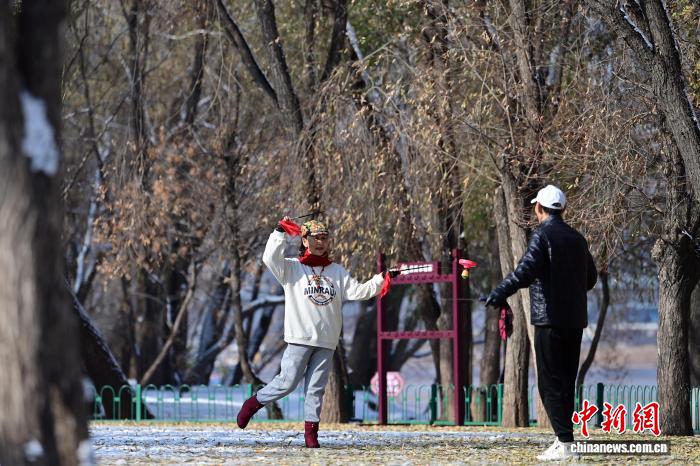 11月24日,苦肃兰州迎去古冬尾场落雪。图为市平易近雪后正在雪天上抖空竹。中新社记者 9好旦删 摄