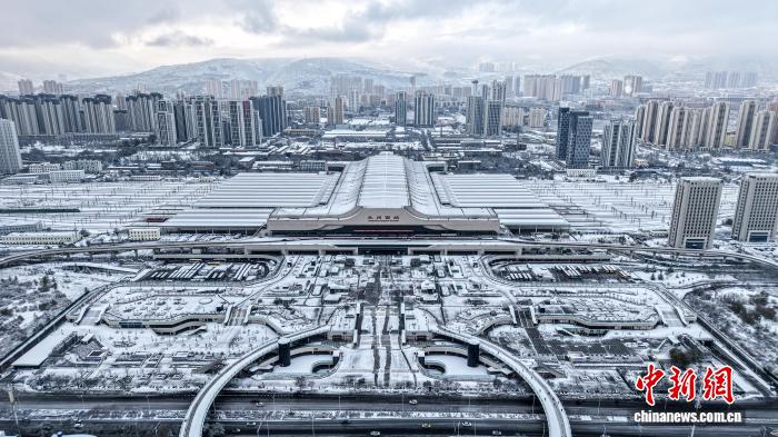 11月24日,苦肃兰州迎去古冬尾场落雪。图为雪后的兰州西站。(无人机像片)中新社收 弛专止 摄