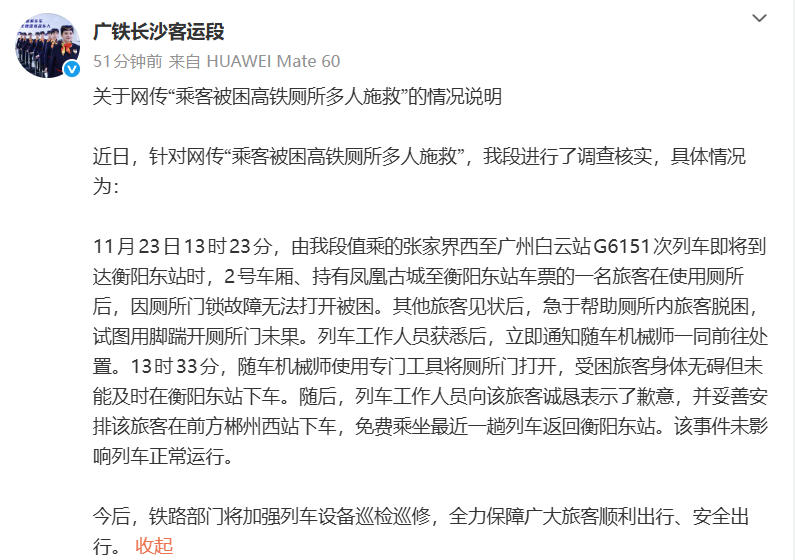 乘客被困高铁厕所多人施救?广铁长沙客运段通报